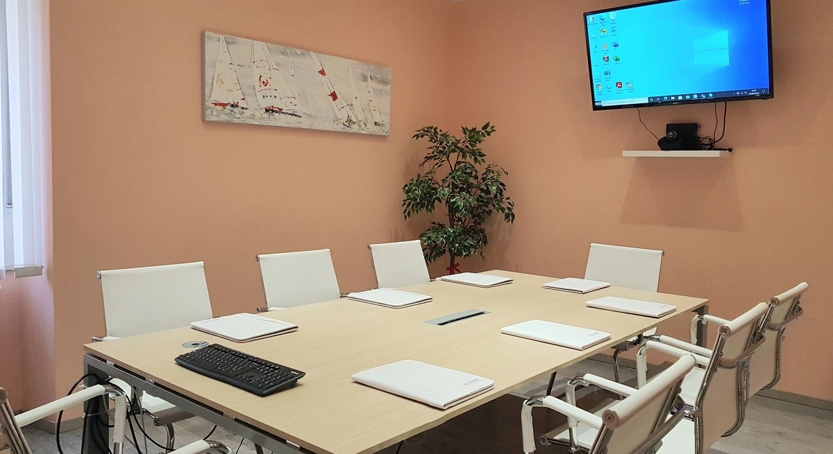 In più avrai a disposizione una saletta riunioni multimediale, con TV 50″ 4K e presa HDMI per eventuali presentazioni, meeting e videoconferenze.